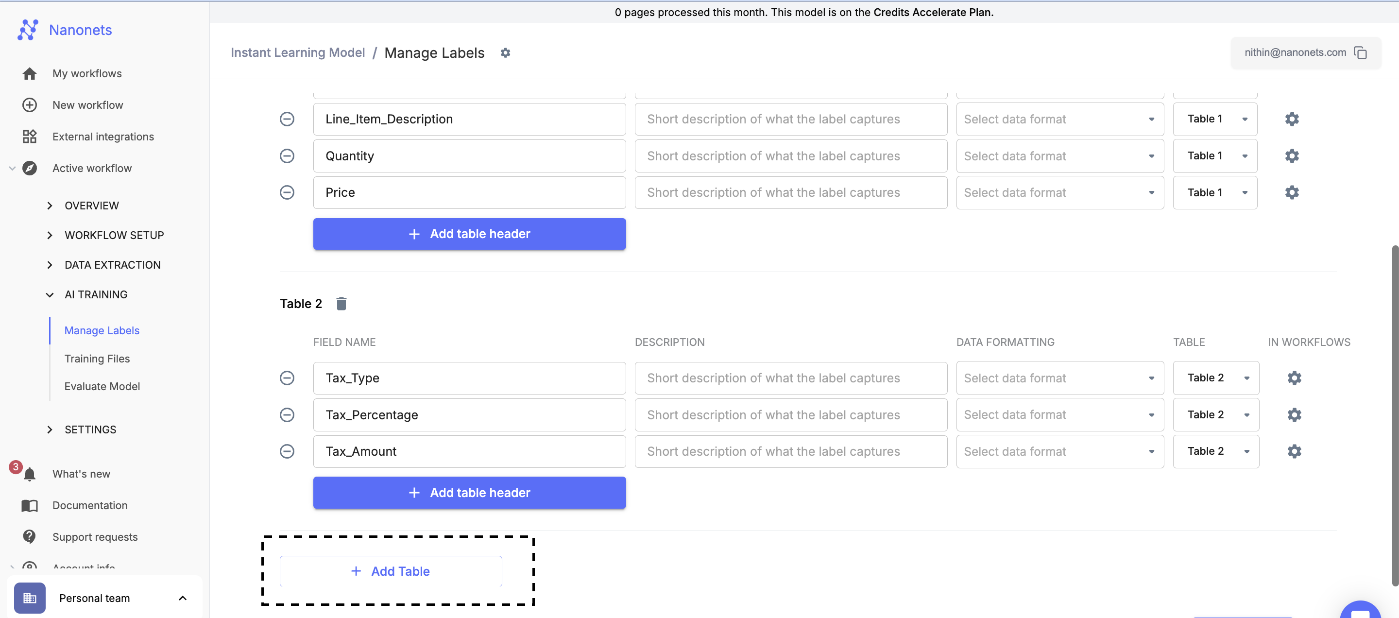 • Multiple Tables It is possible to create multiple Tables for extraction and define labels for each table by using Add Table Button